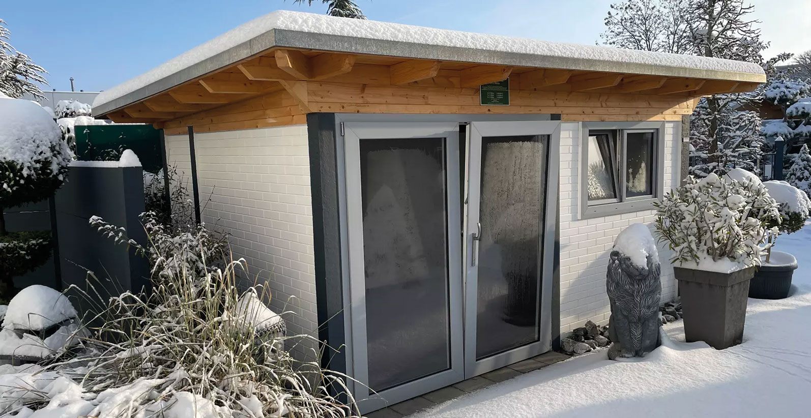 - Betongartenhaus mit Motivplatte Timber